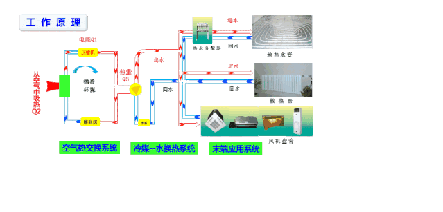 空氣源熱泵從原理上說, 生活中常見的冰箱也是一種熱泵, 夏天冰箱里面是4-7度, 外面是30-35度, 當我們把一盤熱菜放進冰箱時,菜里面的熱量散發到冰箱里面的冷空氣中,冰箱里面的機器開始工作,把里面冷空氣里面的熱量搬到外面的空氣里面來,這樣不斷的工作, 冰箱里面才能維持一個恒定的溫度,當我們用手摸冰箱的側面或后面時,會有點微微的熱, 這就是冰箱在進行熱量的搬運!